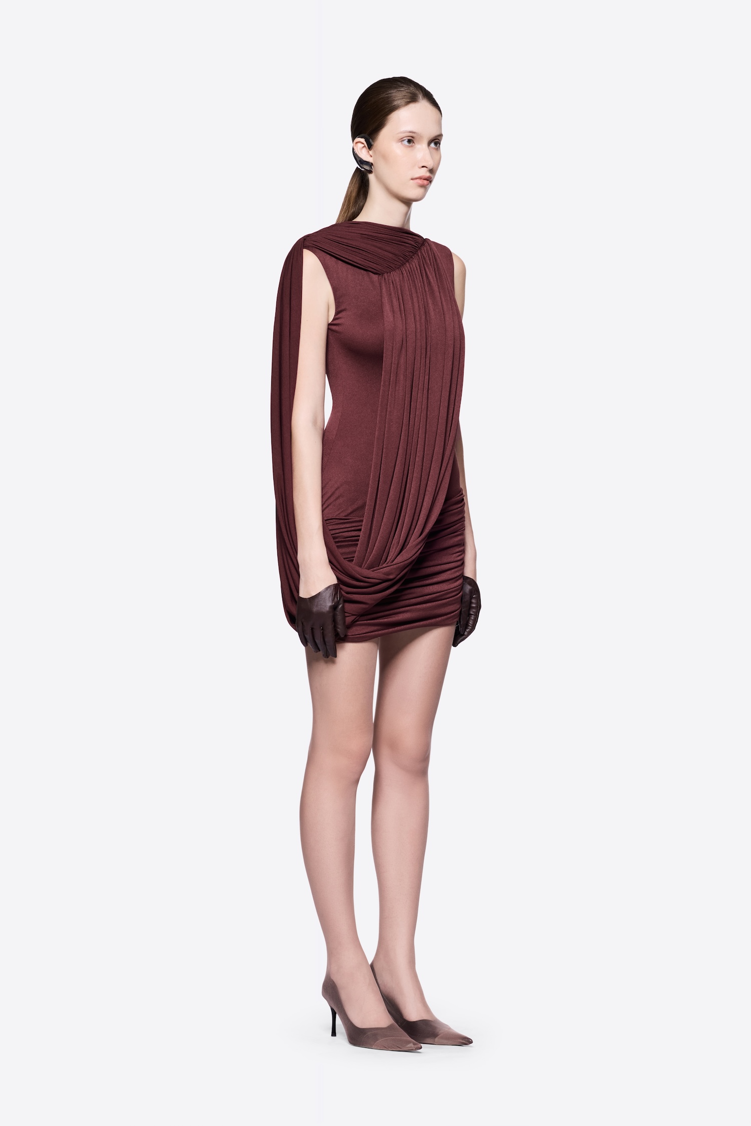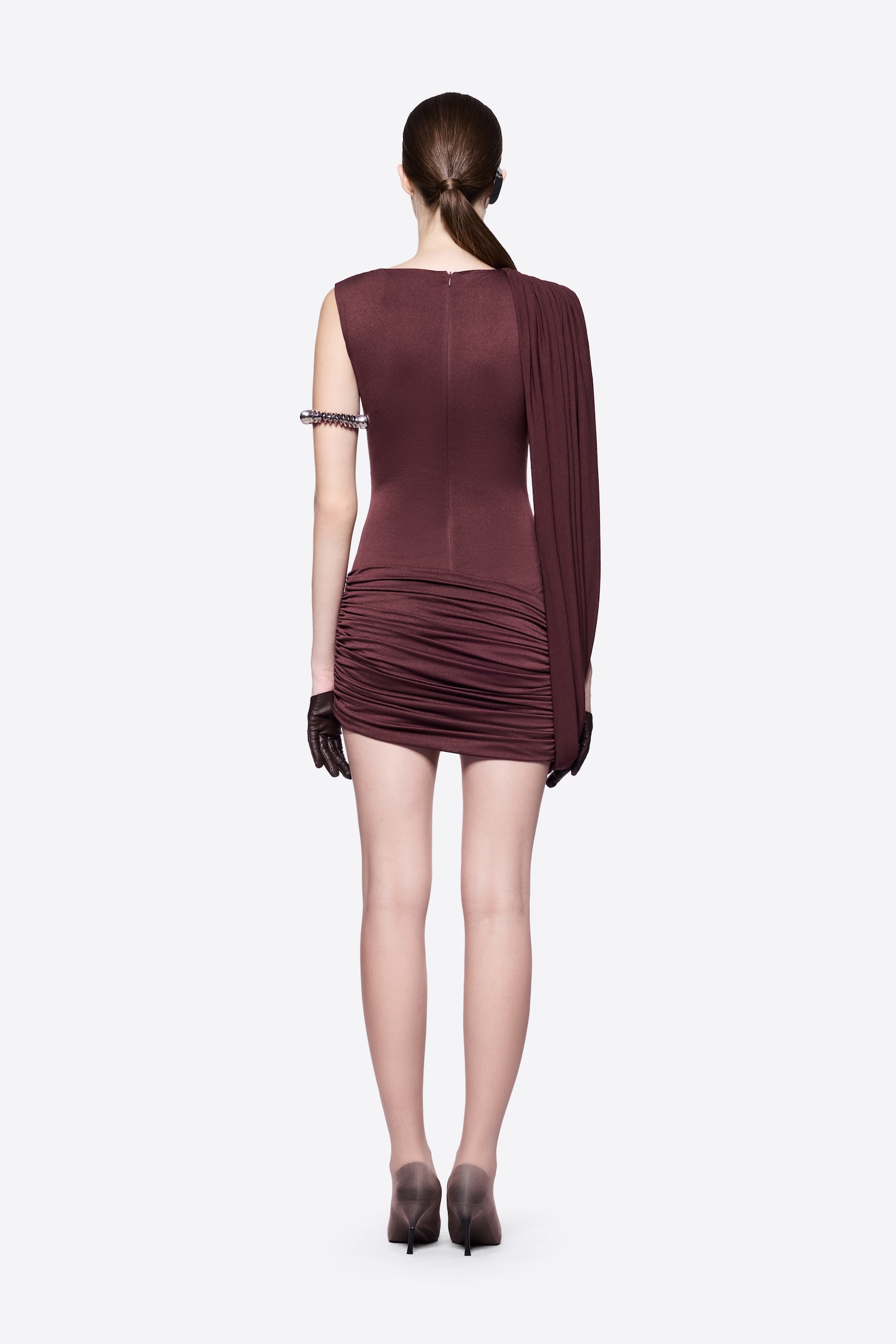 FORM-FITTING SHOULDER-PADDED MINI DRESS WITH ASYMMETRICAL CROSS-DRAPED SHOULDER DETAILS