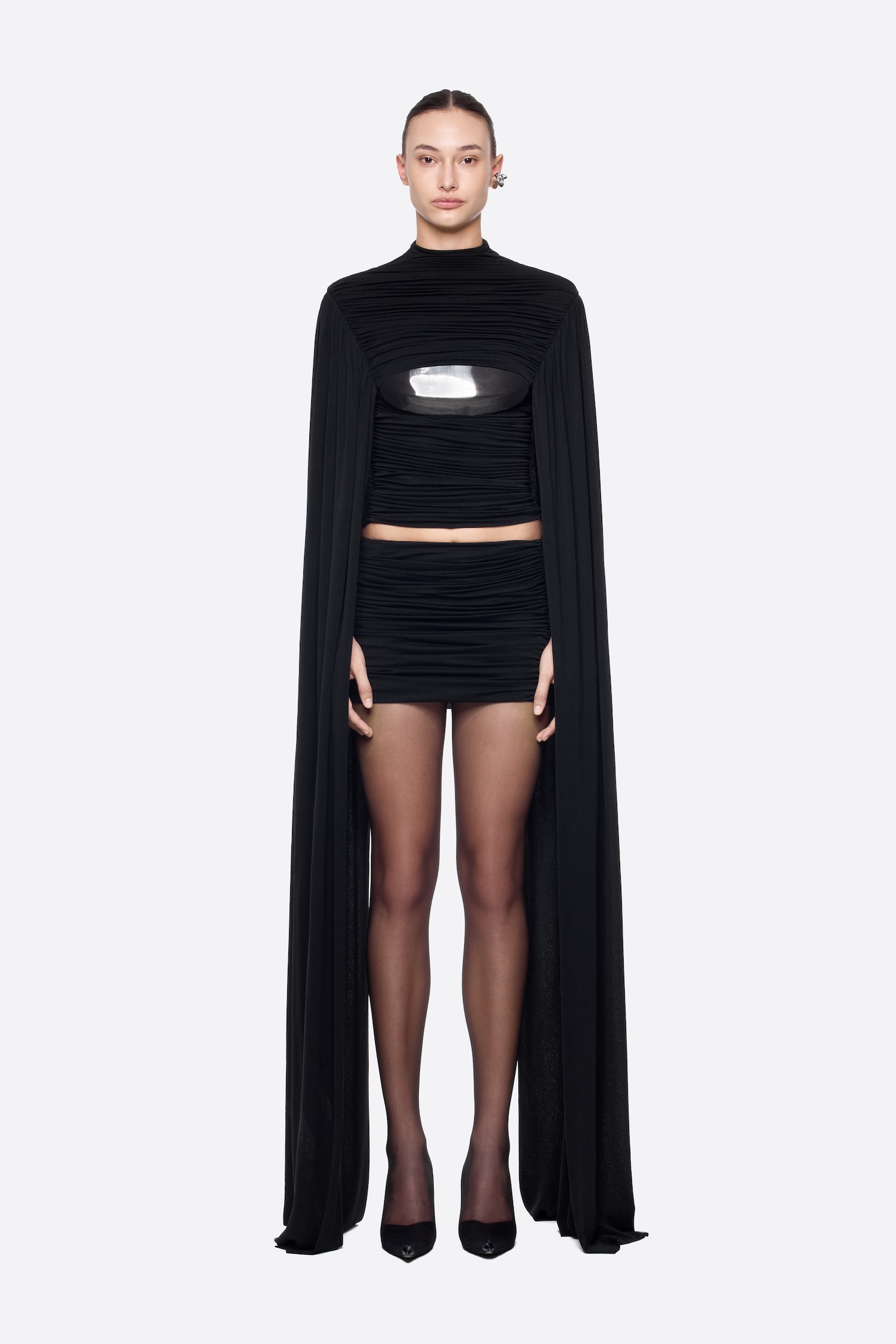 – DETAIL: SYMMETRICAL DRAPING DETAILS, LONG CAPE