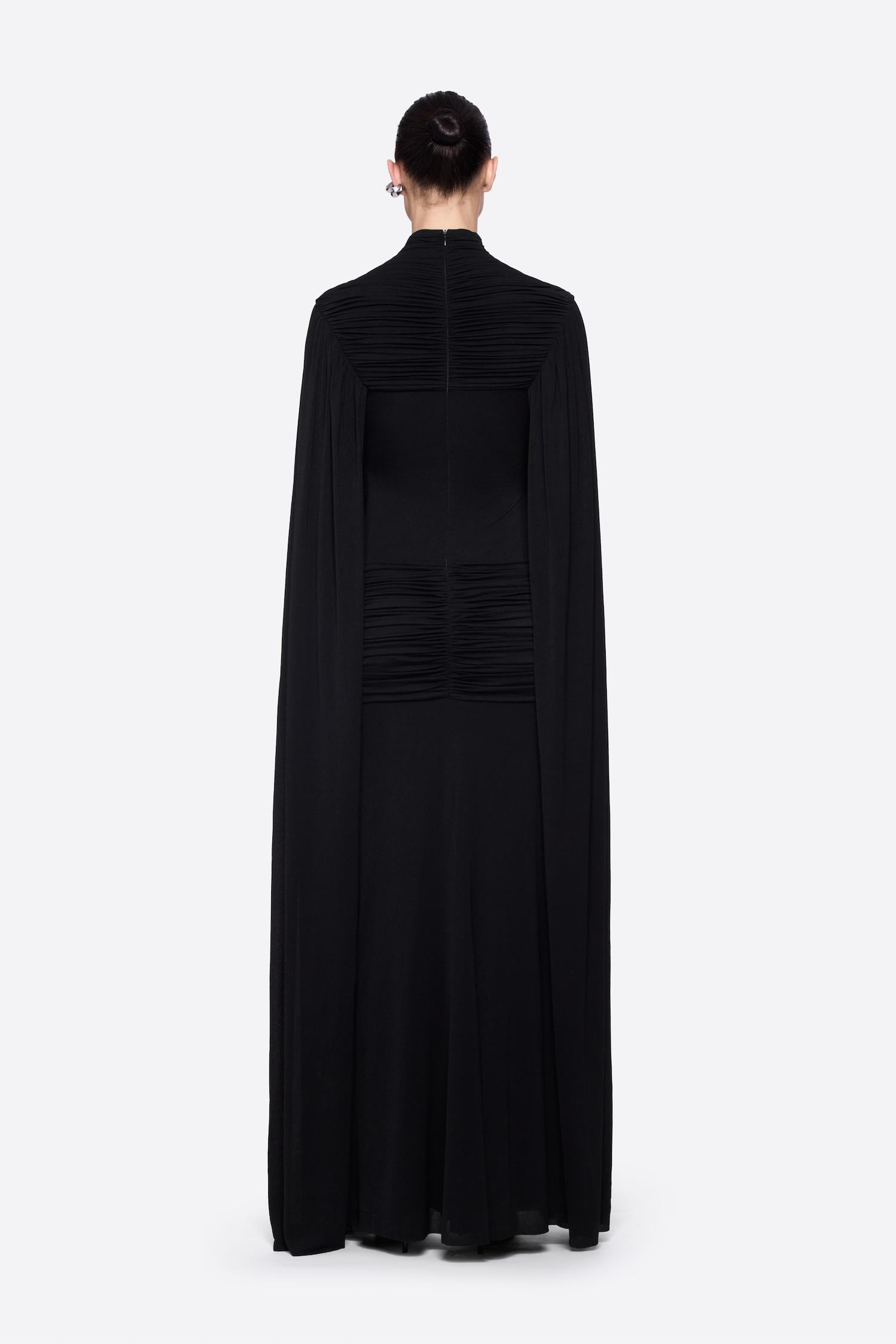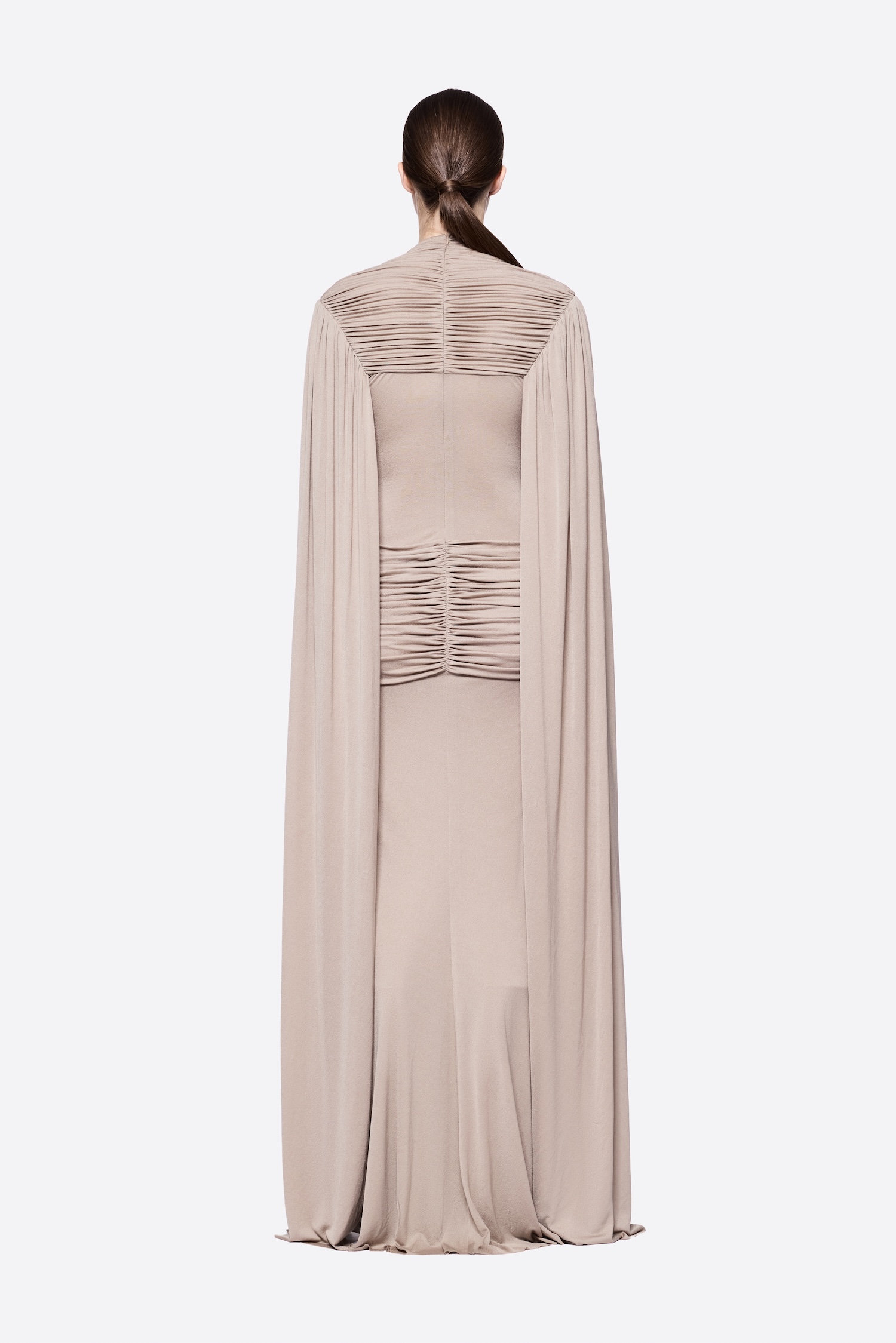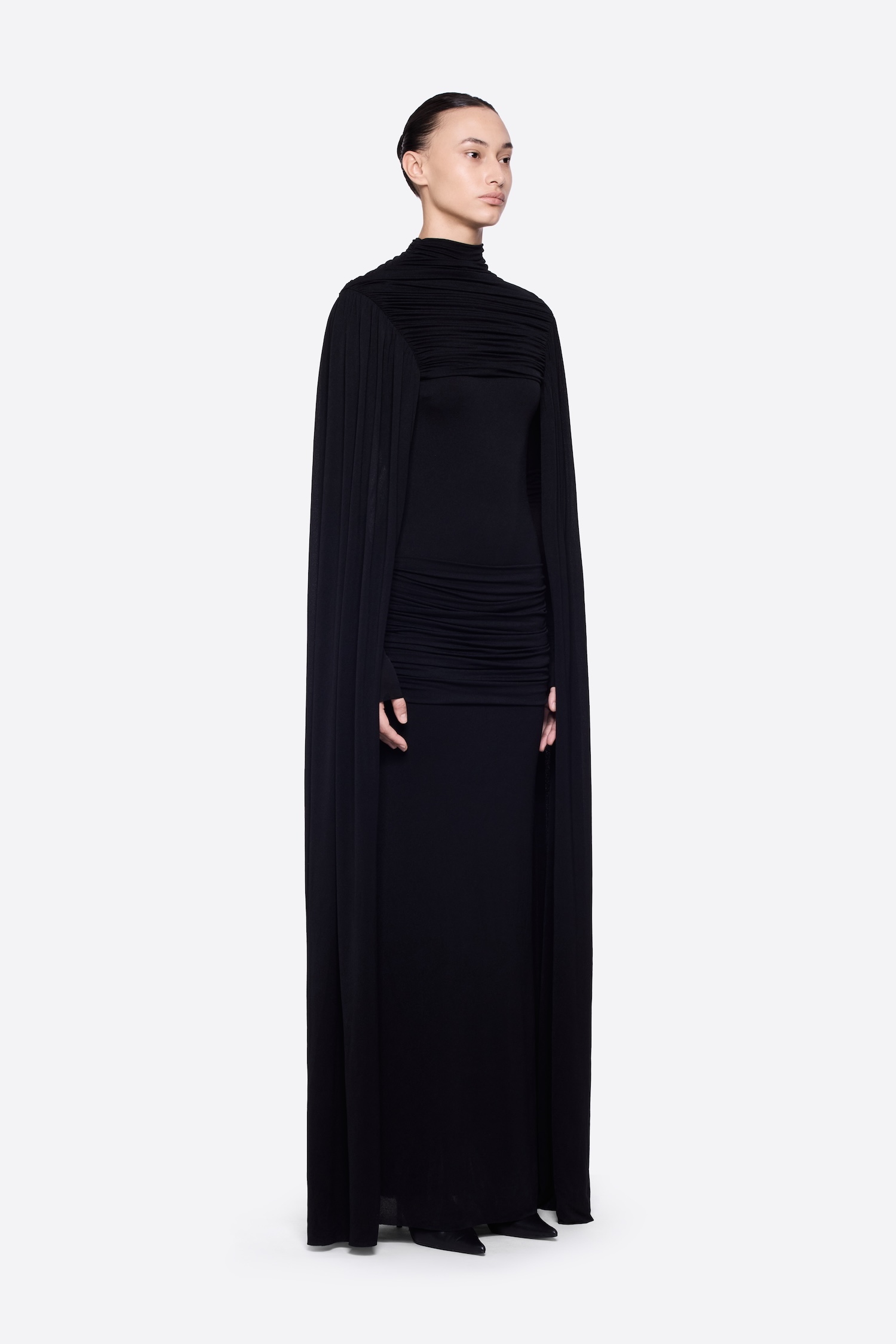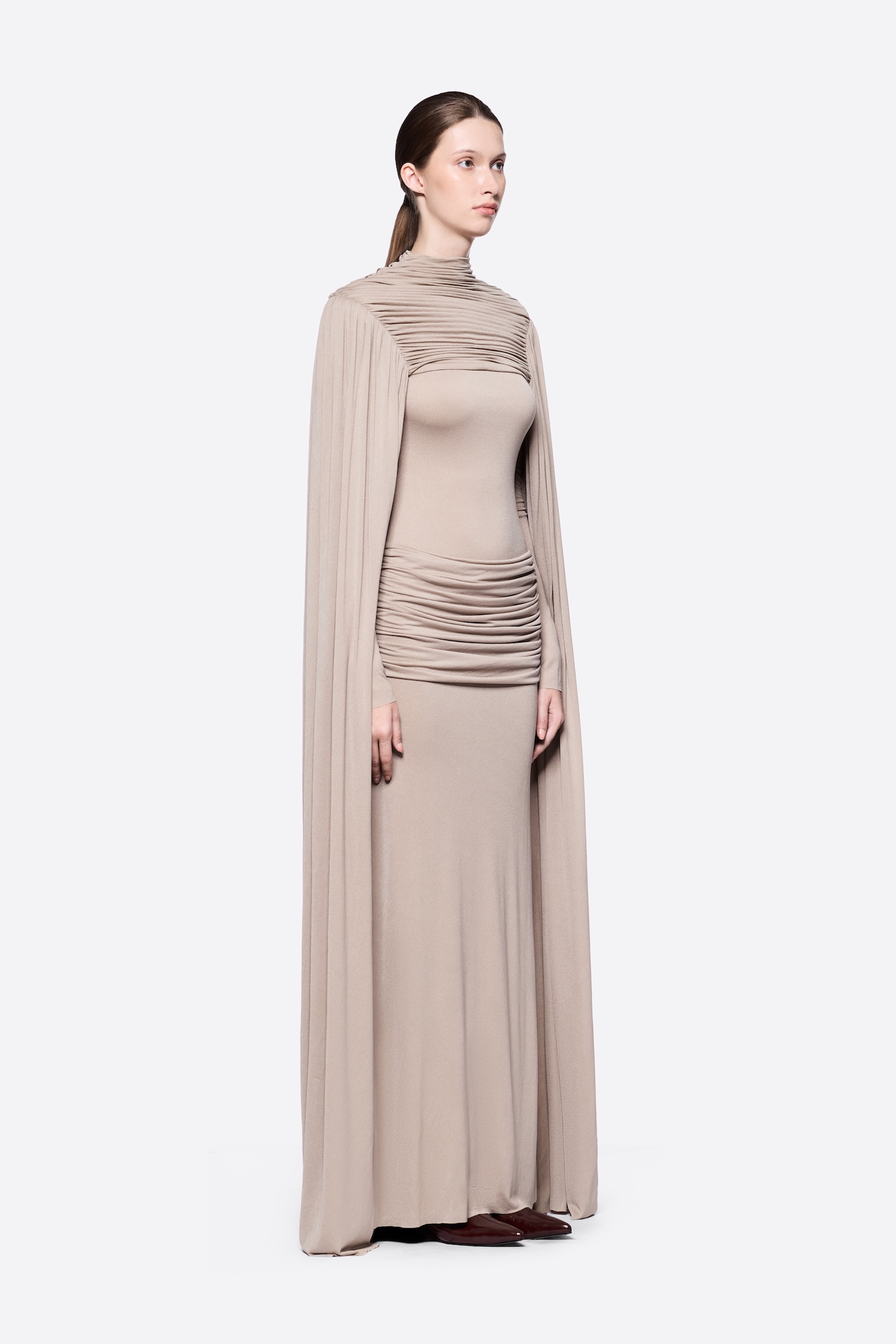 FORM-FITITNG LONG CAPE DRESS WITH SYMMETRICAL DRAPING DETAILS