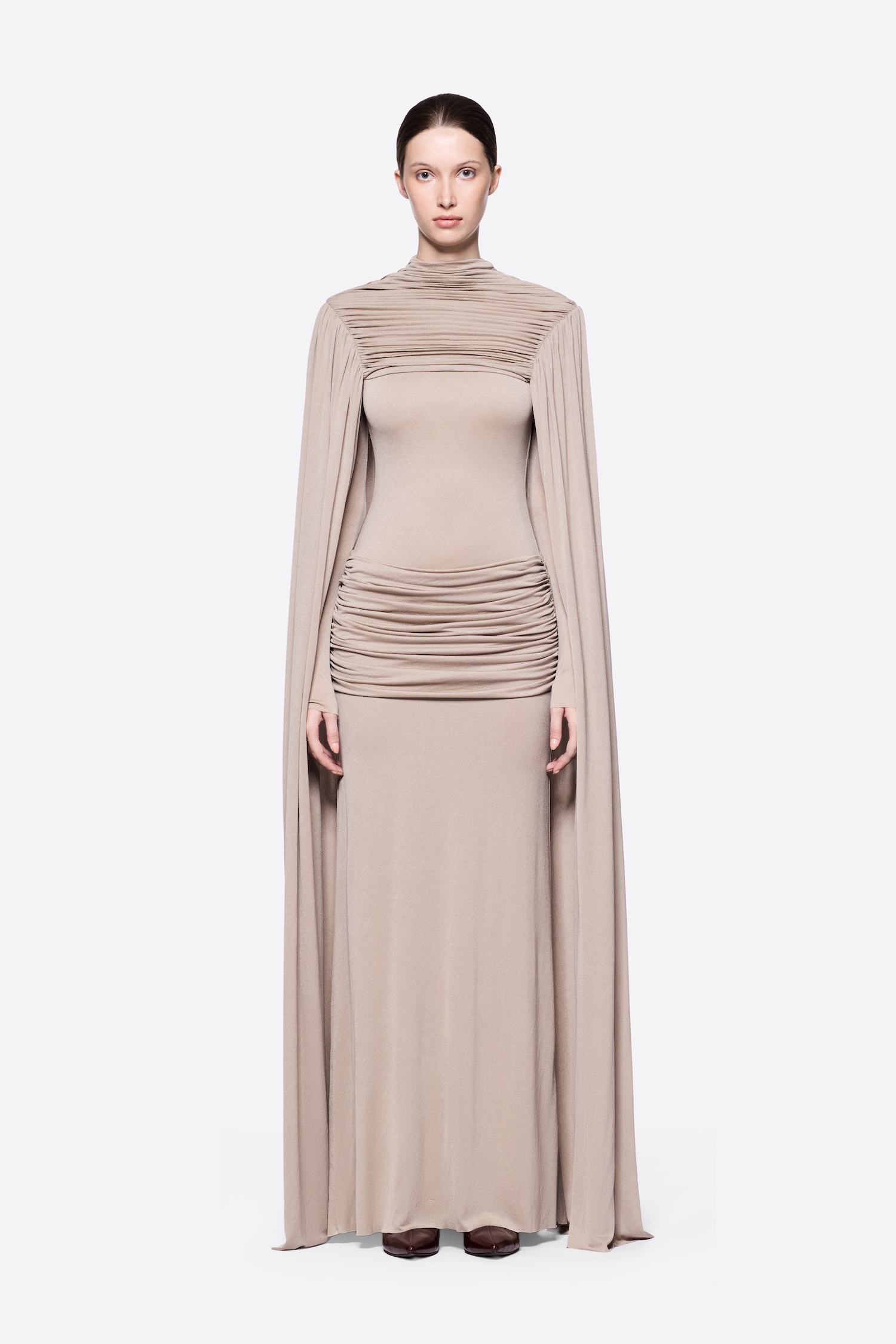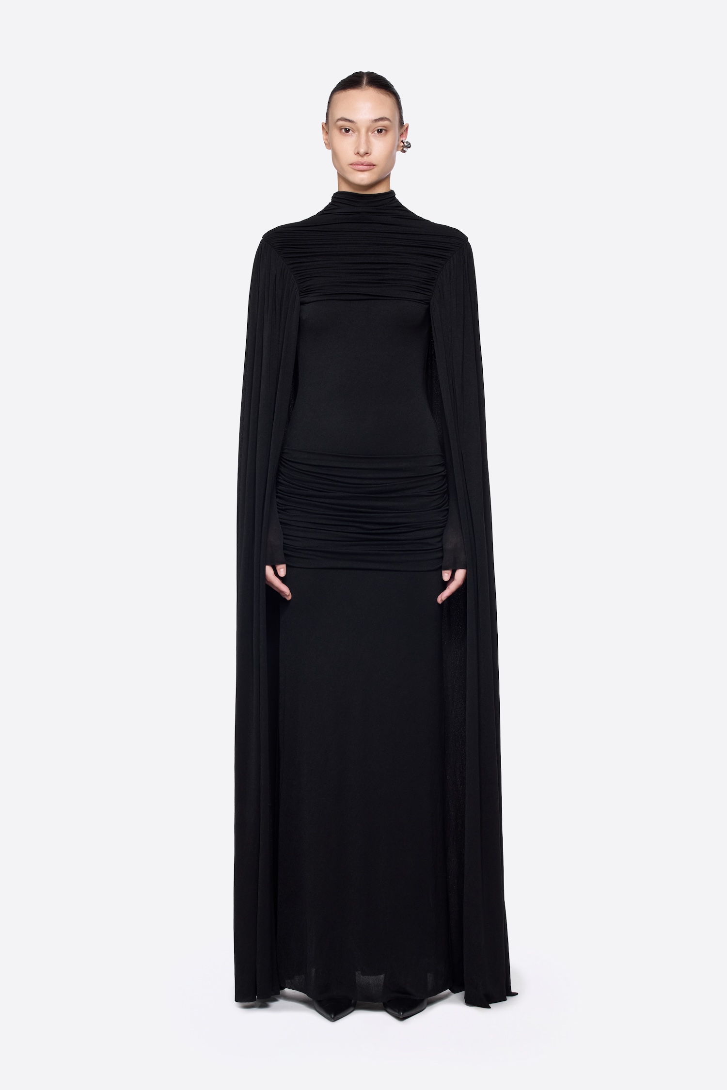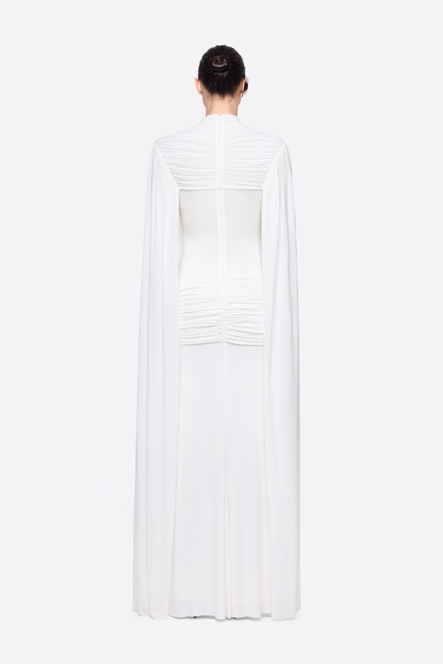 FORM-FITITNG LONG CAPE DRESS WITH SYMMETRICAL DRAPING DETAILS
