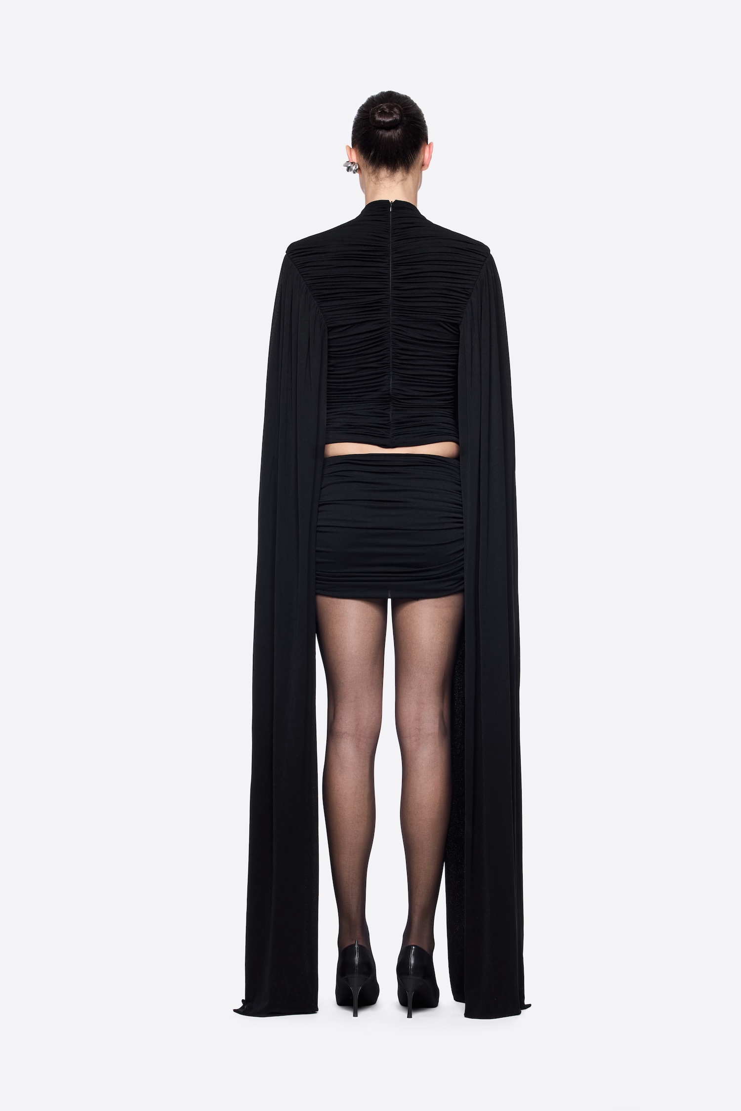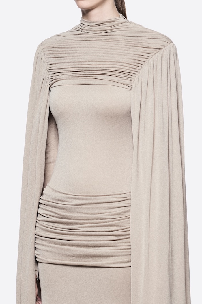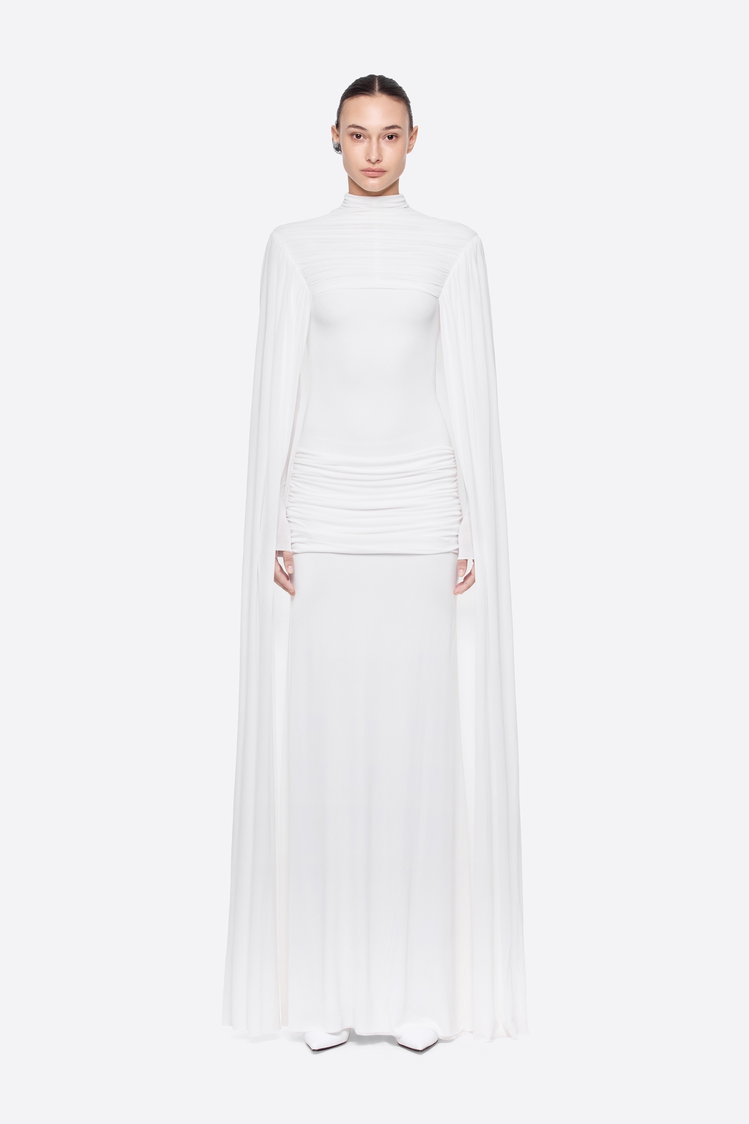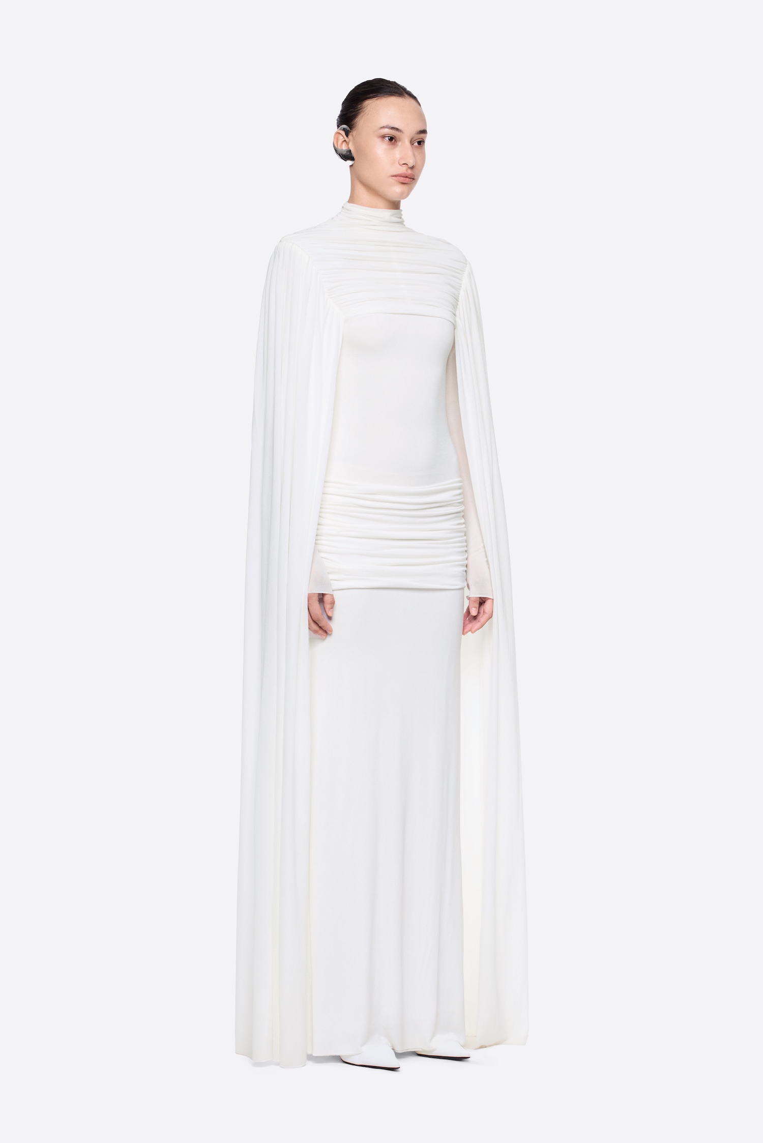 FORM-FITITNG LONG CAPE DRESS WITH SYMMETRICAL DRAPING DETAILS
