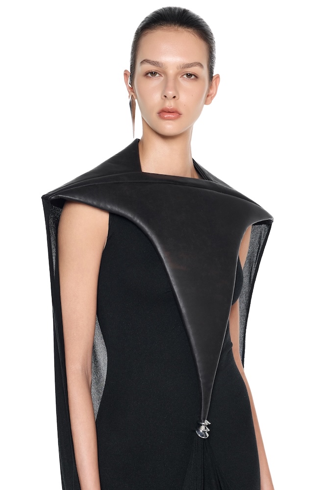 – DETAILS: SCULPTURAL SHOULDERS ACCENTS, SYMMETRICAL DRAPING CONCENTRATED AT THE HIPS, SCULPTURAL CONSTRUCTION, METAL DETAIL