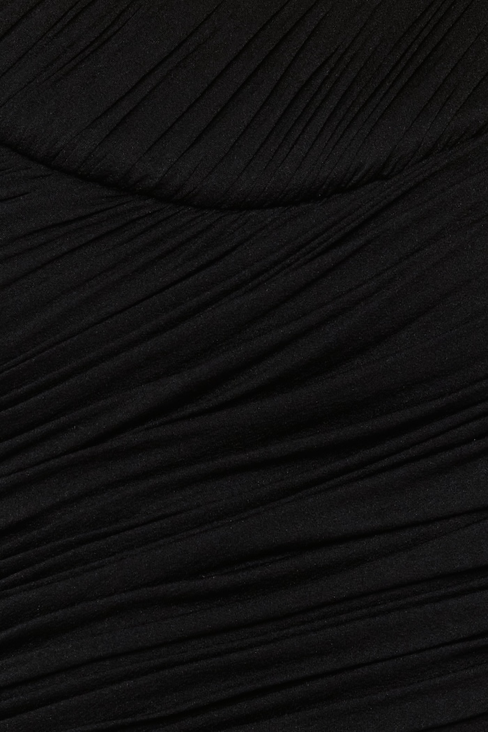 – DETAIL: ASYMMETRICAL DRAPING DETAILS, PUMP DRAPING CUP DETAILS, METALLIC DETAILS ON BOTH SHOULDER