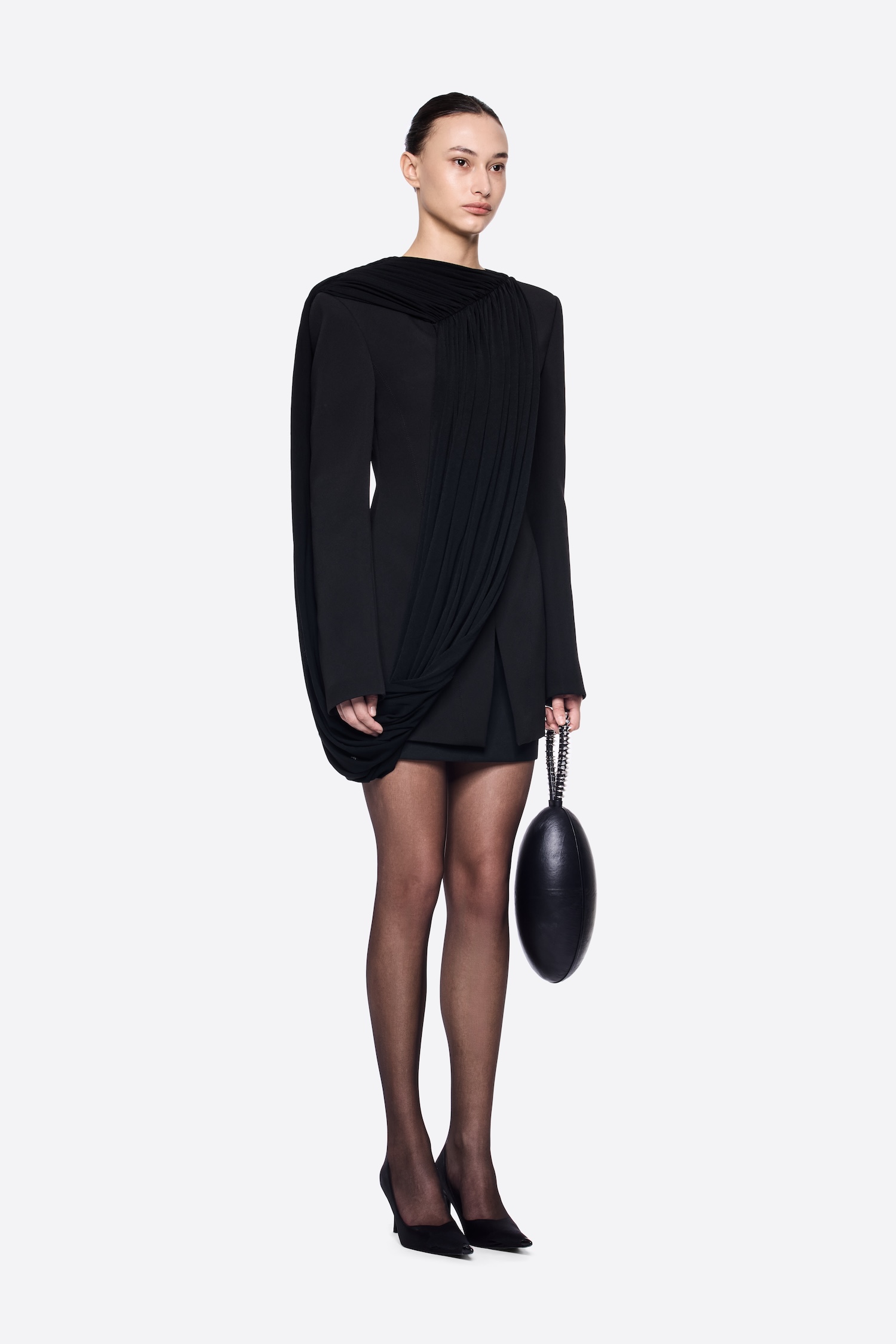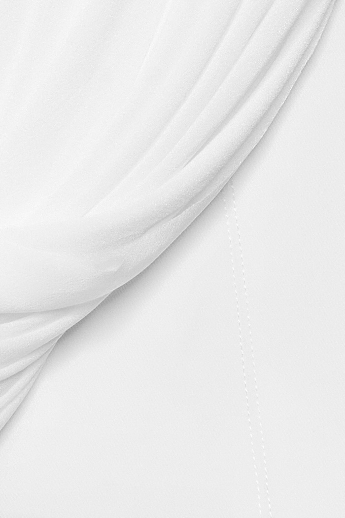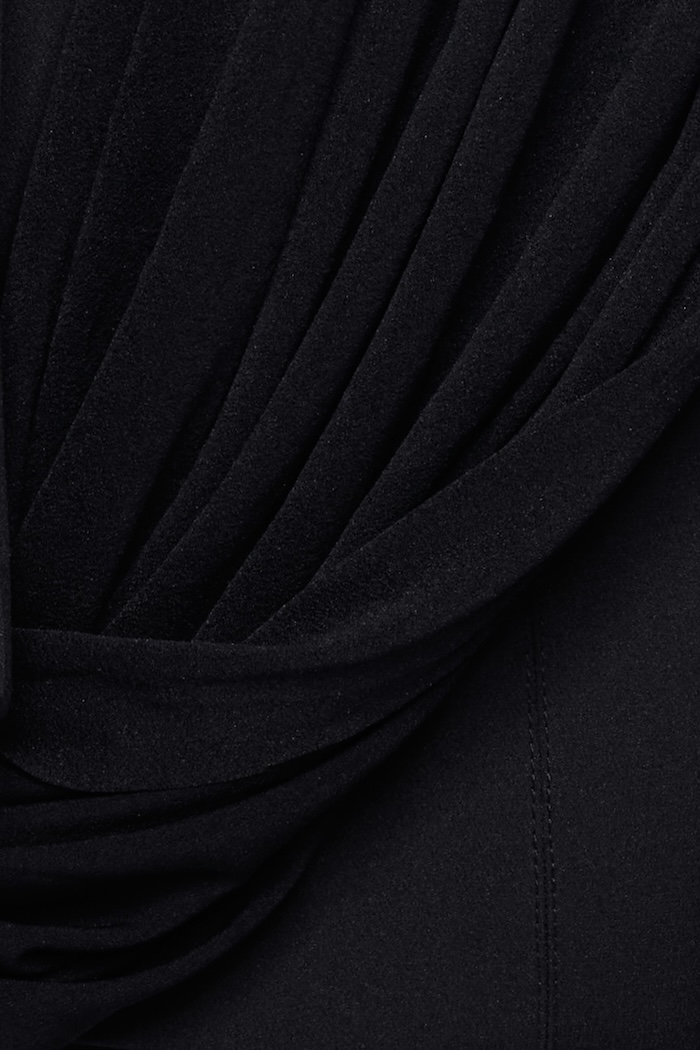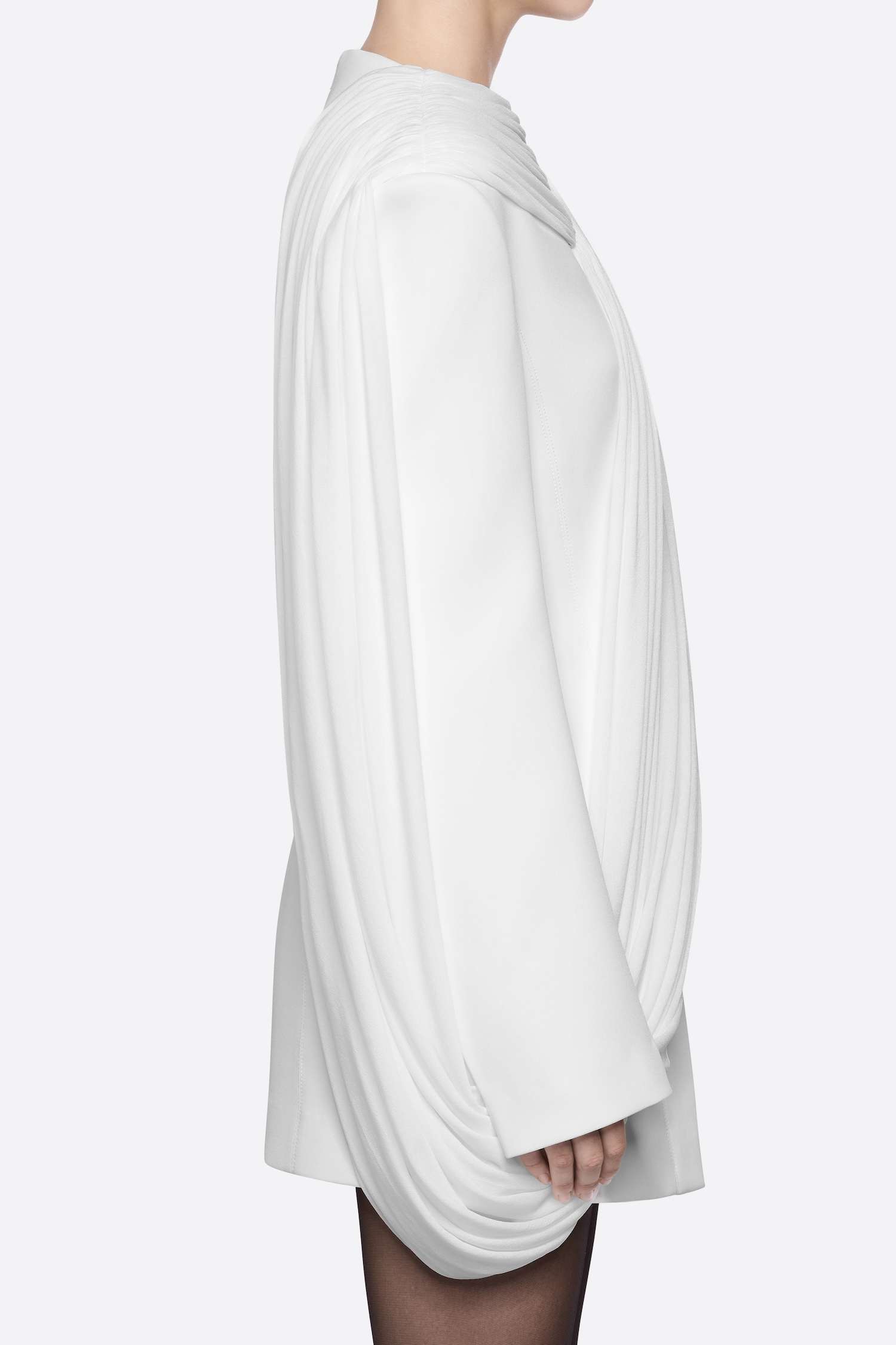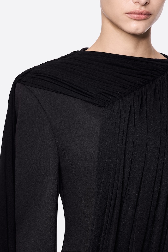 – DETAIL: LONG SLEEVE, ASYMMETRICAL, CROSS-DRAPED SHOULDER, SYMMETRICAL RAISED STITCHES