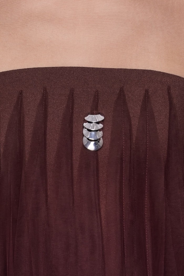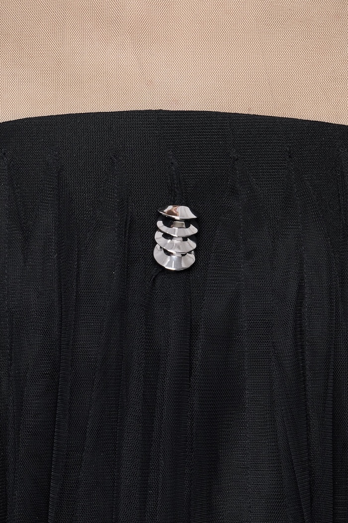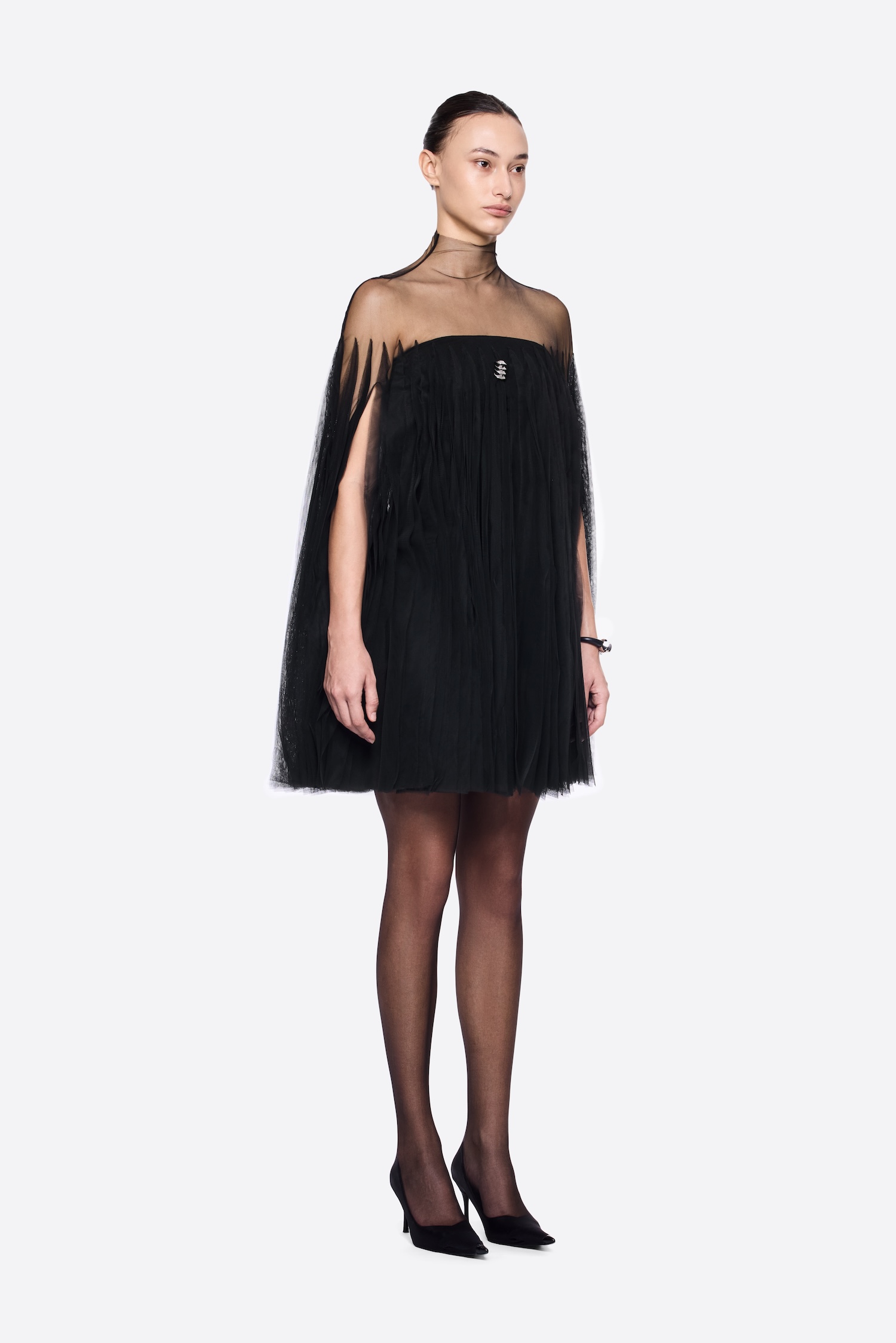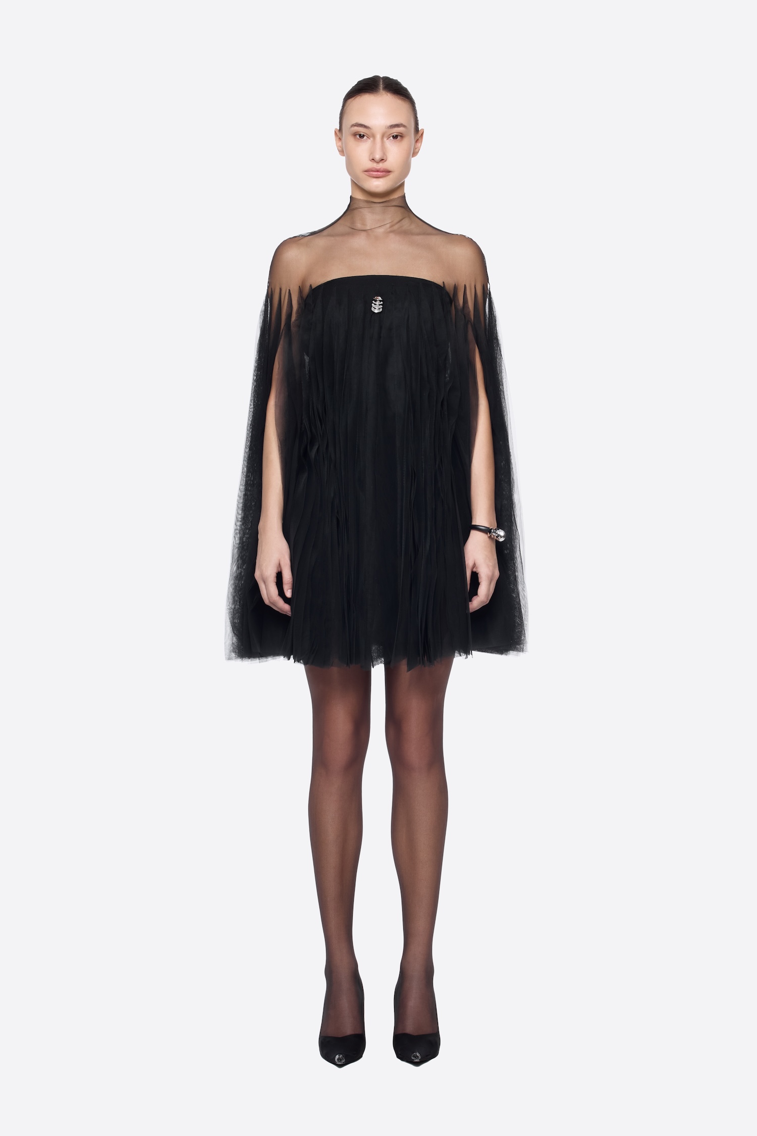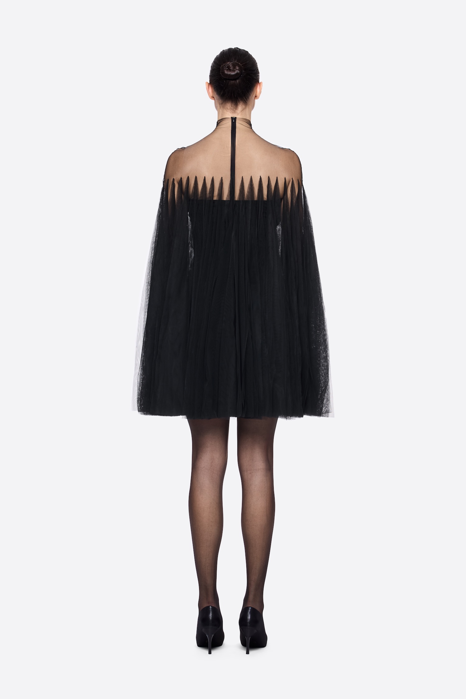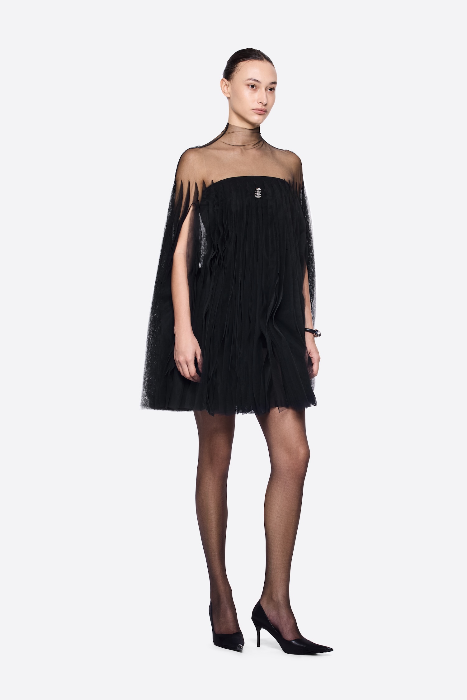 – DETAIL: TRIANGULAR SHEER CAPE, SHEER SHOULDER COVERING, METALLIC DETAIL. MINI STRETCH CREPE KNIT DRESS, SHEER SHOULDER COVERING