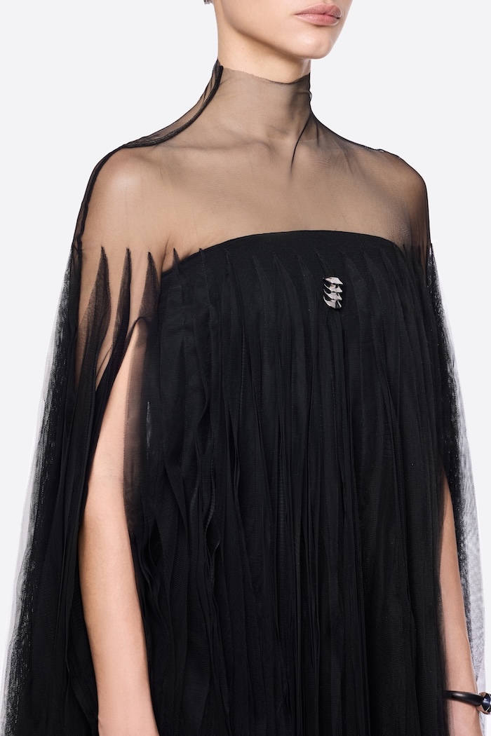 LOOSE-FIT SHORT TRIANGULAR SHEER CAPE WITH METALIC DETAIL.