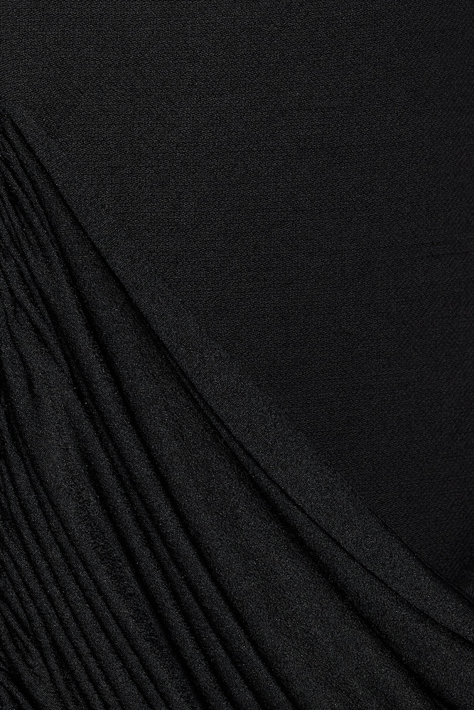 MID-LENGTH DRESS, FEATURING A STATEMENT METAL DETAIL AT THE CHEST WITH SYMMETRICAL DRAPING CONNECTING THE FRONT AND BACK.
