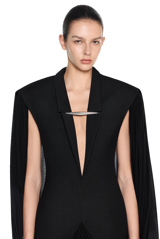 – DETAILS: SCULPTED LAPELS, SCULPTURAL SHOULDER ACCENTS, SYMMETRICAL DRAPING CONNECTING THE FRONT AND BACK, METAL RING DETAIL AT THE CHEST