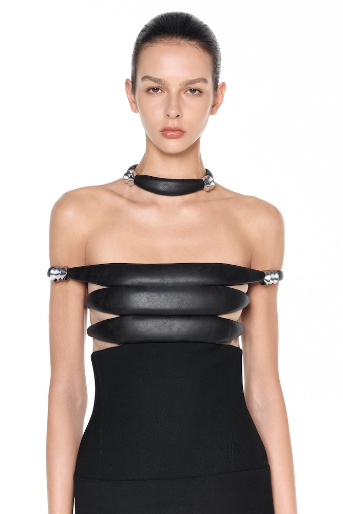 – DETAILS: HIGH NECK, SCULPTURAL SHOULDERS ACCENTS, BRASS ZIPPER CLOSURE, SYMMETRICAL SCULPTURAL CONNECTING DETAILS, METAL DETAILS