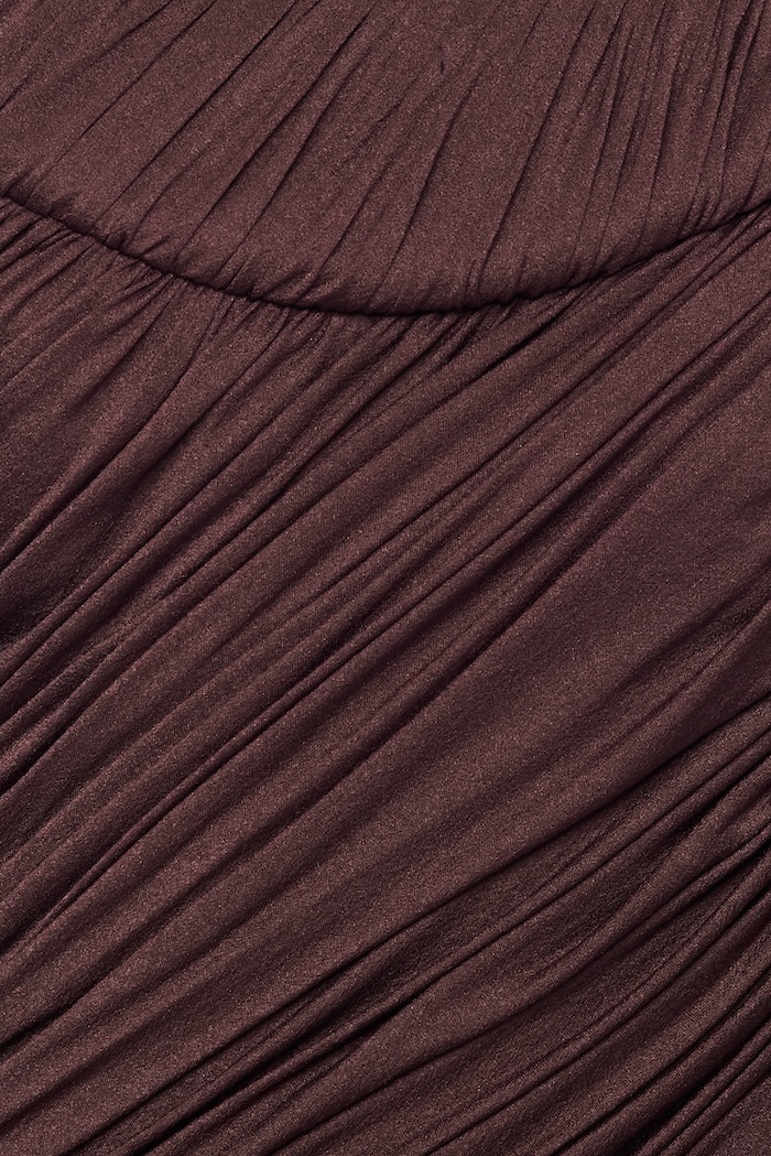 – DETAIL: ASYMMETRICAL DRAPING DETAILS, PUMPED DRAPING CUP DETAILS, METALLIC DETAILS ON BOTH SHOULDERS