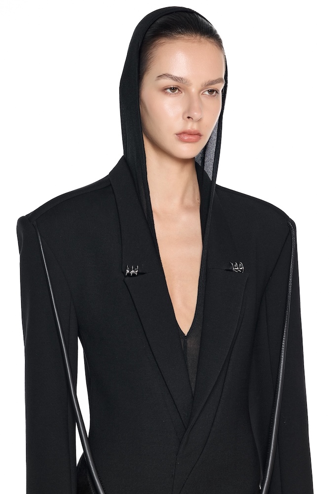 – DETAILS: HIGH NECK, STRUCTURED SHOULDERS, SCULPTED COLLAR, SCULPTURAL SHOULDER ACCENTS, STATEMENT STRAP WITH METAL DETAIL